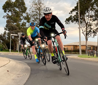 That routine repeats. Alarm. Coffee. Breakfast. Kit. Helmet. Shoes. Ride. And the practice of a prologue Tuesday continued too, though the radical move of rolling a different course at least put the spice of variety into the morning. Nosed north on Numurkah Rd to Radio Australia (a head wind wasn't part of the plan) then steering south on Verney Rd back to town had a sense of urgency. I took a guess at the distance, so making it to the 6am grid at Friars was a stab in the dark. Back and berthed with 4 minutes spare, Phil, Hommie, Snowman, Sandy, Belly, Dippa, Coggo and AvantiAndy arrived with a craving for k's, Sandy supplementing Heady's habit of heading us out of town. Two rows formed but nobody seems to call the configuration, it just happens by chance (although the chance of a headwind would have kept it Indian file). A hint of a north northwester played no part in the pace. I'd joined the advance line on Coggo's wheel crossing the truck route, waiting for the rotational routine to promote to forward. It didn't take long, shift were short. Coggo hit the front with vindaloo in his velocity, maybe to hurry Hommie along but it caught me napping. And it continued over Central Ave as I tried to match his wheel ; looking to the distant bridge at School Rd didn't help, I'd be in ruin before reaching it at this rate. Relief came when Coggo called the roll-over 200 metres shy. (Was that a hologram of KillkennyPaul and Softa riding west? Maybe it was that early sun-up in my eyes?)