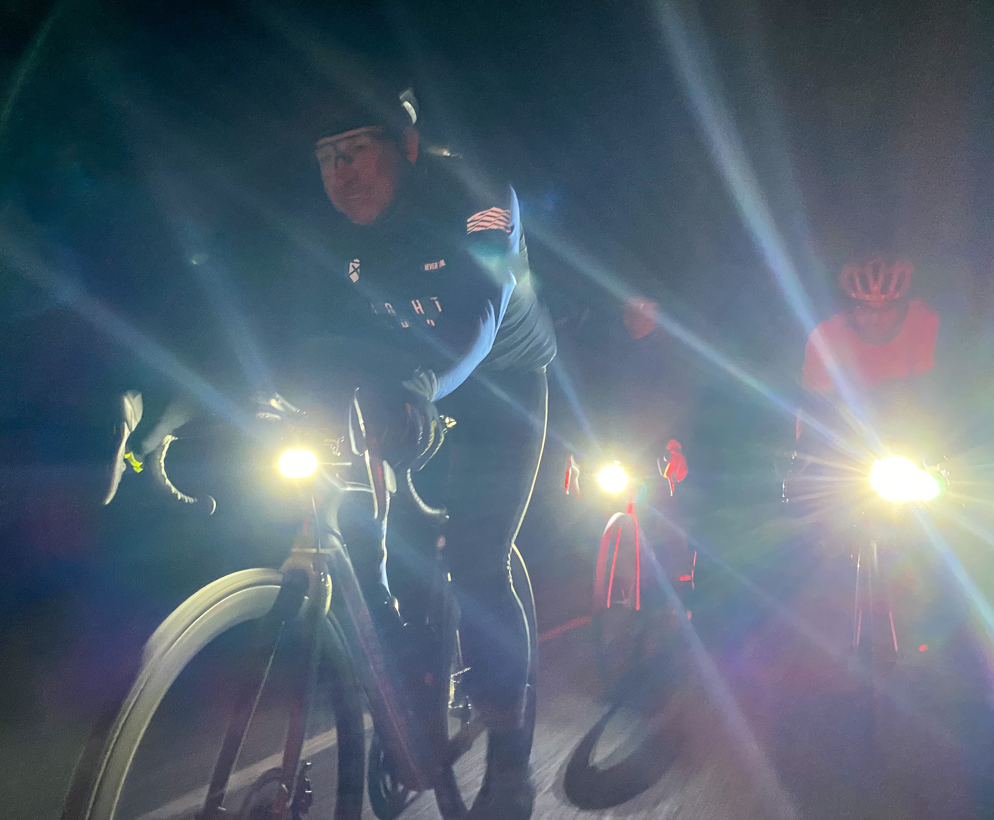 Quips went quiet when a recalcitrant rear wheel wouldn't refit and the Jamis was close to being launched over the paddock's fence. (repairs in dark, damp and freezing conditions rarely go well) The restart shuffled me down the order to be on Trav's (stubborn) wheel for the north leg of Coach Rd. I'd found my second wind as the bunch crested Boundary Rd's bridge (frustrating when you're 3rd wheel and bound to be half cooked when finally at the front). With winter's solstice just a few days away we'll be over the hump soon and eventually get longer days though a couple of months of cold still to come doesn't do much for enthusiasm.