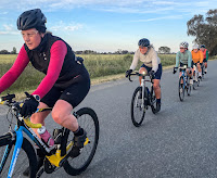 It was an effective warm-up though, arriving at the grid almost ready for the peloton's pace. The Godfather, Wozza, Bo, Rocket, Bruce, Lenny and Tina tucked into Pistol and Emil's tow to the truck route, the few who'd braved bare arms probably feeling the fluctuations in temperature that I'd insulated against. Several regulars were awol though a team of ten suited the circuit well. Wozza's wheel was my berth in the bunch though I'd already reached the rear as Emil and Bruce towed us to Euroa Rd. Time to follow Tina to the pointy end. Lenny and The Godfather did their duty from River Rd's bridge to the dip, Tina setting sights on the quarter horse fence while The Godfather behaved as co-pilot.